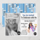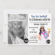 Elegant birthday photo invitation. "You Are Invited to Celebrate with Me" in modern font. Beautiful, tropical design with girl in lei holding cocktail and colorful blue abstract design on the back of card. Photo and details all changeable.