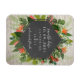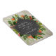 A wedding save the date magnet featuring a tropical botanical design with a chalkboard geometric design over a white brick background.
