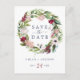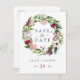 This tropical breeze save the date announcement postcard is perfect for an elegant spring or summer wedding. The floral design features red, burgundy, blush pink and white flowers on a wreath of watercolor tropical greenery with a relaxed Hawaiian feel.