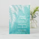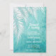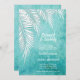 White palm fronds on an ocean turquoise blue watercolor background highlight these brunch and bubbly couples wedding shower invitations. MATCHING items in our store.
