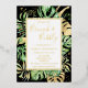 This elegant tropical bridal shower invitation is perfect for the bridal champagne brunch. It features green and gold palm, philodendron, and fern leaves on a black background behind an elegant gold foil frame. The gold foil text is fully customizable. Gold foil splatters accentuate this exotic botanical design and brings a bit of sophisticated whimsy to the invitation. This island oasis invite is perfect for any elegant outdoor, beach or tropical themed bridal brunch.