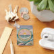 This vibrant, illustrative piece combines nautical scenery with mystical celestial symbols. At its center, a large circular window frames a tranquil sunrise or sunset over rolling ocean waves, rendered in a soothing palette of teal, seafoam, and lavender. Outside this frame, lush tropical foliage and palm fronds anchor the foreground, while the upper sky transition into a twilight scene featuring a golden crescent moon and shimmering stars. The artwork utilizes a mix of flat graphic shapes and soft watercolor textures, creating a peaceful, dreamlike coastal atmosphere that feels both modern and mythical.
