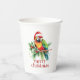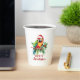 This tropical theme Christmas paper cup design features a tropical bird with a Santa hat holiday greenery and red retro Merry Christmas typography.