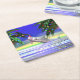 Paper coasters with my artwork of a dolphin wearing a red Christmas hat and holding a candy cane between decorated palm trees.