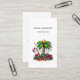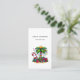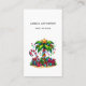 Business card with a seasonal holiday image. A tropical palm tree decorated in festive lights with a star on top. A giant red and white candy cane sticking out of the sand. Christmas presents under the tree. Whimsical and fun.