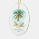Add your family name and photo to this tropical beach themed Christmas keepsake ornament featuring a palm tree over two beach chairs, decorated with Christmas lights and baubles. On the back is an easy to personalize photo template.