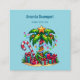 Square business card with a seasonal holiday image. A tropical palm tree decorated in festive lights with a star on top. A giant red and white candy cane sticking out of the sand. Christmas presents under the tree. Whimsical and fun.