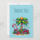 Thank you card with a seasonal holiday image. A tropical palm tree decorated in festive lights with a star on top. A giant red and white candy cane sticking out of the sand. Christmas presents under the tree. Whimsical and fun.