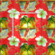 Hawaiian pattern of Palm tree decorated with Christmas ornaments and lights, with a retro surfboard leaning against the Christmas tree in front a sunset over the ocean. Happy Holidays from the warm sandy beaches of your favorite tropical island beach.