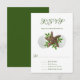 Tropical Christmas party reply cards with menu list, in green and white with starfish and sand dollar design. Holly leaves are tucked between a big sea star and white sand dollars in the center of vertical white cards with green text. Reverse is solid dark green. Use for holiday office parties, or December weddings and big birthday celebrations.