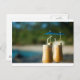 Tropical cocktails for two served in tall glasses with straws alongside the seashore, shallow dof and copyspace