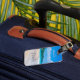 A luggage tag with a photograph of a gorgeous vacation location. Bright blue sky, soft sandy beach with tropical crystal clear blue waters. A lush tree covered mountain in the background. Scenic and tranquil photography.