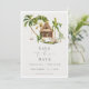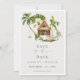 This wedding save the date invitation is a tropical jungle design with the colors of nature. It features palm trees, luscious rainforests, and bungalows nestled within a beautiful tropical paradise setting.