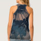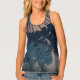 The abstract artwork by ZoeSPEAK on this racerback Tank Top was made from an original photograph of a tropical plant, a white bird of paradise. The plant grows very tall, with huge leaves which spread out in a fan shape. In this design, the stems of the leaves are at the top, with the leaves fanning downward. The leaves are in muted shades of mid to dark blues against a pale peach sunset sky background.