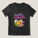 Bachelorette t-shirts for the ladies of the wedding party. Black, short sleeve tee shown, with lavender name, bright pink party title and a tropical design. Include the title of the woman on the back, "Bridesmaid", etc., or remove the sample wording to order shirts with nothing on the back. A collection of yummy cocktails sit amongst hibiscus, anthurium and green leaves. A perfect design for a cocktail party to celebrate the bride. Choose any t-shirt color and style.