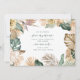 Wedding announcement for the couple who decided to elope - in a tropical floral border design that reads - Love is patient, we are not. Add your wedding details. This elopement announcement reverses to your wedding photo on the back.