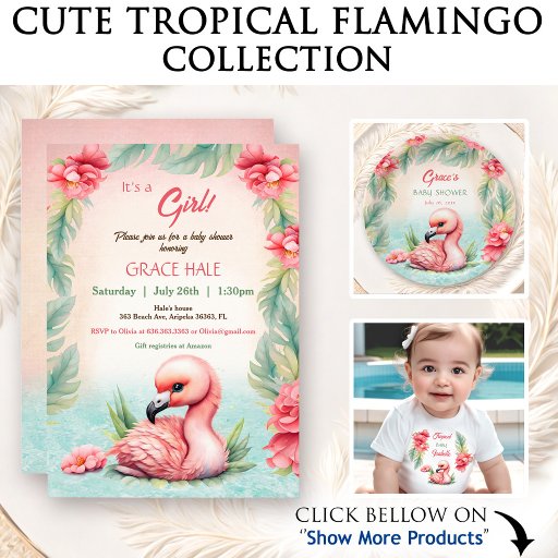 Elegant and cute banner with an adorable baby flamingo and pink tropical flowers for a summer girl baby shower or any tropical-themed party. Easily personalize the text. - Kate Eden Art