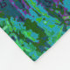 The abstract fabric pattern by HomeWare on this Fleece Blanket was created from an original photograph of a royal poinciana tree. Some of the tree's tropical leaves are in sunlight, in bright yellow greens. Others are in shadow, in shades of blue from aqua to deep teal, with purple highlights. The background is almost black. The design has an overall fabric texture.