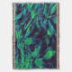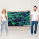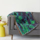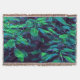 The abstract fabric pattern on this Throw Blanket by HomeWare was created from an original photograph of a royal poinciana tree. Some of the tree's tropical leaves are in sunlight, in bright yellow greens. Others are in shadow, in shades of blue from aqua to deep teal, with purple highlights. The background is almost black. The design has an overall fabric texture.