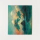 This is a watercolor tropical fantasy view in turquoise and orange tones, depicting the sky, clouds, sea, palm trees during sunrise.