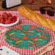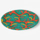 This artwork bursts with tropical energy, featuring bold monstera leaves in rich greens and golden accents set against a vivid red backdrop. The graphic shapes, simplified veins, and rhythmic repetition create a seamless pattern that feels both modern and lush. Its high‑contrast palette and lively composition make it ideal for textiles, and statement décor—radiating warmth, vibrancy, and a sense of tropical celebration.