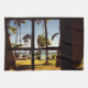 Tropical Fiji Beach Scene - Photograph of a beach in the Fiji Islands with palm trees, hammocks and a picnic bench seen through the open shutters of a beach hut.