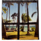 Tropical Fiji Beach Scene - Photograph of a beach in the Fiji Islands with palm trees, hammocks and a picnic bench seen through the open shutters of a beach hut.
