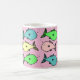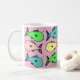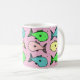Colourful illustration of fish decorate this coffee mug. A gift idea for anyone who keeps tropical fish maybe. Tropical fish design. An attractive designed mug decorated with a pattern of colourful fish. Gift idea for a tropical fish owner. Pink background.