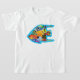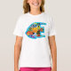 The t-shirt's design is of several very colorful tropical fish in a grouping shaped like an angel fish.