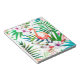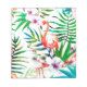 A tropical theme artwork of a pink flamingo and green tropical jungle plants with hibiscus flowers and palms against a neutral white background. A fun and colourful art piece.