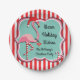 Tropical Flamingo Christmas paper plates with santa hat, ornament collar and striped legs and candy canes. Change wording to your party info. Matching items with this design!