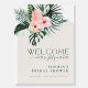 Celebrate the bride-to-be with this modern and elegant bridal shower welcome sign featuring a pink and green tropical floral bouquet on a light stone colored arch and signature script font.