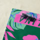 Modern, trendy floral beach towel with a pink flowers and green tropical leaves with a purple backgroud.Personalized it with your name.