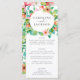 This lush tropical wedding menu features lovely watercolor flowers and tropical leaves. The floral tropical design includes hibiscus flowers, plumeria flowers, and tropical leaves that encircle the happy couple's names. Below, customize the template with your event's menu details. The back of the wedding menu features a gorgeous tropical floral pattern. Matching wedding stationery is available in our Tropical Floral wedding collection.