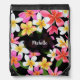 Tropical Hawaiian plumeria flowers in white, yellow and pink on a black background is ready for your name in chic lettering in any color on transparent black overlay on the front (can be deleted or moved on the layout.) Create for yourself or give as a gift.