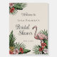 This elegant bridal shower welcome sign features hand-drawn tropical flamingo themed illustrations in black ink, showcasing pink flamingos, hibiscus and jasmine flowers, a pineapple and tropical leaves. The back features a beautiful pattern with these elements plus a tropical drink.