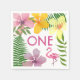 Colorful, Hawaiian, tropical floral 1st Birthday paper napkins with palm trees and pink flamingo.