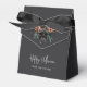 A spooky chic Halloween design featuring a tropical floral skull illustration topped with orange and burgundy island flowers and green jungle foliage on a smoky black background. Personalize this unique and elegant Halloween favor box with two lines of custom text.