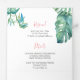 Bring vibrant tropical flair to your celebration with this all in one seal and send wedding invitation, designed with a custom watercolor map, hand-painted monstera palm leaves, and bright hibiscus flowers in shades of pink, orange, turquoise, and green. The outside middle flap features your couple’s photo, while the interior showcases your wedding details in a stylish mix of coral script typography and classic serif fonts.