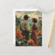 The postcard captures a charming scene in a tropical flower field. The man, adorned in rustic farming attire, stands alongside the woman, whose vibrant red dress contrasts beautifully with the lush surroundings. The vivid blooms create a picturesque backdrop, setting the stage for a timeless moment frozen in this vintage snapshot.