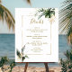 This wedding bar drinks menu sign features watercolor green tropical foliage, monstera, palm tree leaves, banana leaves, and faux gold leaves with a faux gold rectangle frame. It's perfect for a tropical, beach, or destination wedding.
