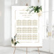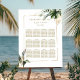 This wedding seating chart features watercolor green tropical foliage, palm tree leaves, banana leaves with gold script, and a gold rectangle frame. It's perfect for a beach or destination wedding