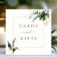 This wedding cards and gifts sign features watercolor green tropical foliage, monstera, palm tree leaves, banana leaves, and faux gold leaves with a faux gold square frame. It's perfect for a tropical, beach, or destination wedding.