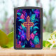 A captivating display of vivid tropical plants showcases neon colors, enveloping a central glowing cross. This artistic portrayal intertwines faith and nature, radiating warmth and serenity in a night-themed garden of lush leaves and vibrant blooms.