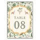 Elegant Indian wedding table number featuring cute elephants and lush tropical leaves pattern.