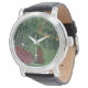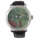 A beautiful black leather watch featuring Henri David Rousseau's painting, "Tropical Forest With Monkeys." The painting shows three species of primates in a tropical landscape featuring red and yellow flowers.