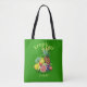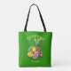 Bag in a collage of colorful tropical fruits including pineapple, papaya, mango, gogi berries, kiwi, and lime, with a tropical theme of rich textures and lush foliage.