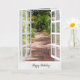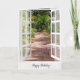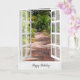 Open window and sheer curtains view of brick path in tropical Florida garden for birthday.