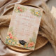 A soft parchment backdrop is framed by lush tropical greenery and coral hibiscus blooms, creating a fresh yet elegant celebration aesthetic. Delicate plumeria accents and airy palm leaves bring a warm, destination-inspired feel, while the classic typography keeps the layout refined and timeless. A subtle graduation cap detail grounds the design with just the right academic touch.