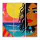 A stunning pop art retro-inspired portrait featuring a woman with flowing dark hair adorned with tropical flowers. Adds a burst of color and positive energy. A scuffed paper effect completes the retro look.